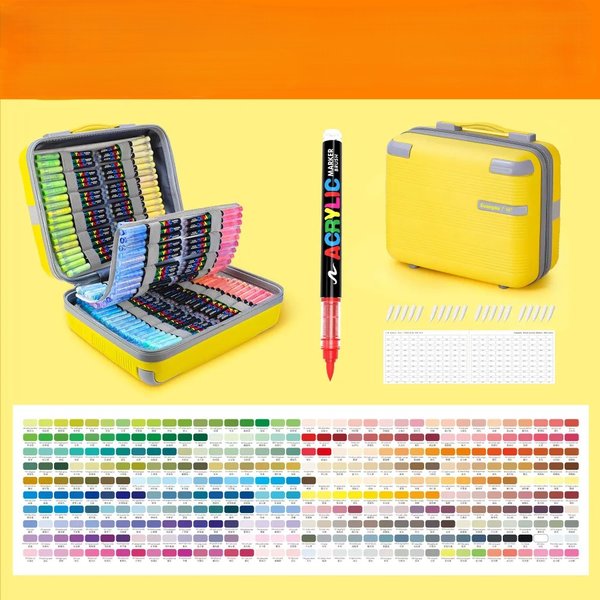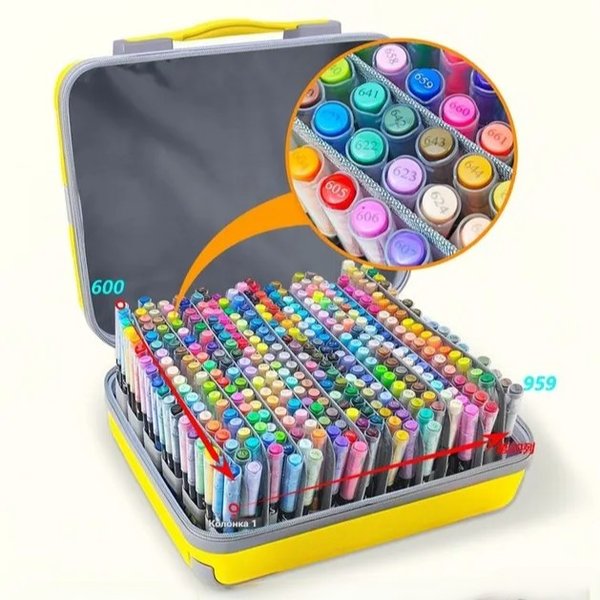 Ваше творчество — мобильно! Все маркеры аккуратно размещены в стильном и прочном чемодане солнечно-жёлтого цвета. Внутри — продуманная система перегородок, которые вы можете расположить горизонтально или вертикально, подстроив организацию пространства под себя. Этот кейс — не просто упаковка. Это ваш персональный портативный органайзер для искусства. Берите его в путешествие, на дачу или на пленэр, чтобы все нужные оттенки были под рукой. В него также можно собрать собственную палитру из любых других художественных материалов (карандашей, линеров, кистей), создав идеальный творческий набор «всё в одном».