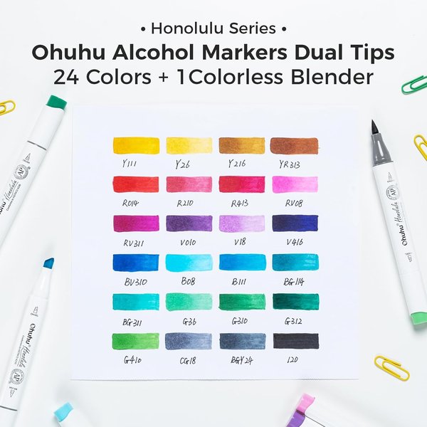 Ohuhu Honolulu 24 оттенка , двусторонние художественные спиртовые маркеры для рисования, кисть и долото.